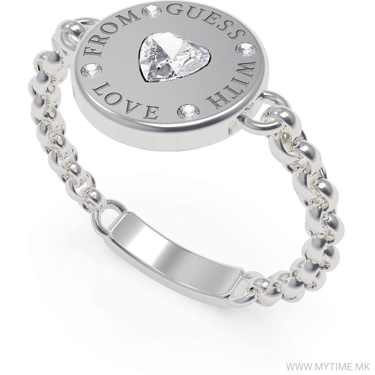 Anello da donna Guess in acciaio lucido, con catena a maglia tonda e placchetta centrale tonda impreziosita da cristalli. Al centro, un brillante a forma di cuore e la scritta incisa: “FROM GUESS WITH LOVE”. Un gioiello romantico e contemporaneo, perfetto da regalare o indossare ogni giorno.