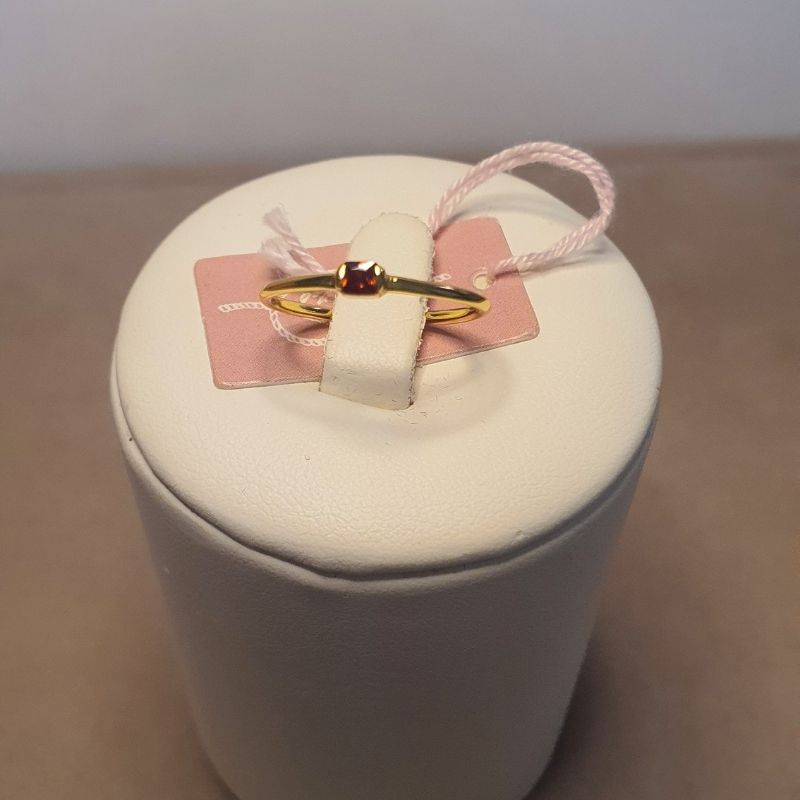 L’anello Piti Mali in argento 925 placcato oro giallo presenta una pietra rossa centrale taglio brillante, incastonata in una montatura sottile e raffinata.