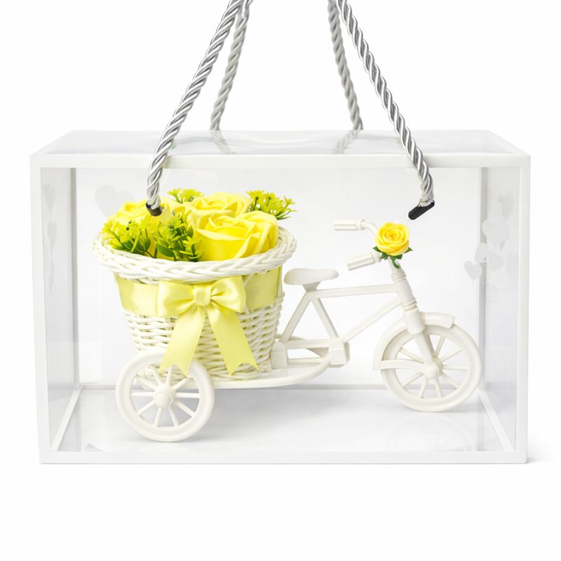 Delicata bicicletta decorativa bianca con cestino di rose gialle, presentata in elegante box trasparente con manici. Un’idea regalo originale e luminosa, perfetta per occasioni speciali e decorazioni raffinate.