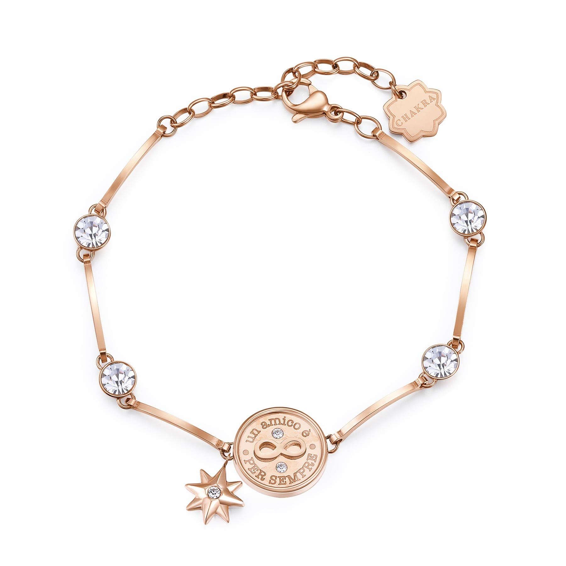 Bracciale Brosway Chakra Simboli BHKB046 in acciaio oro rosa con cristalli; lunghezza 18,5 cm. Infinito & amicizia, eleganza con significato.