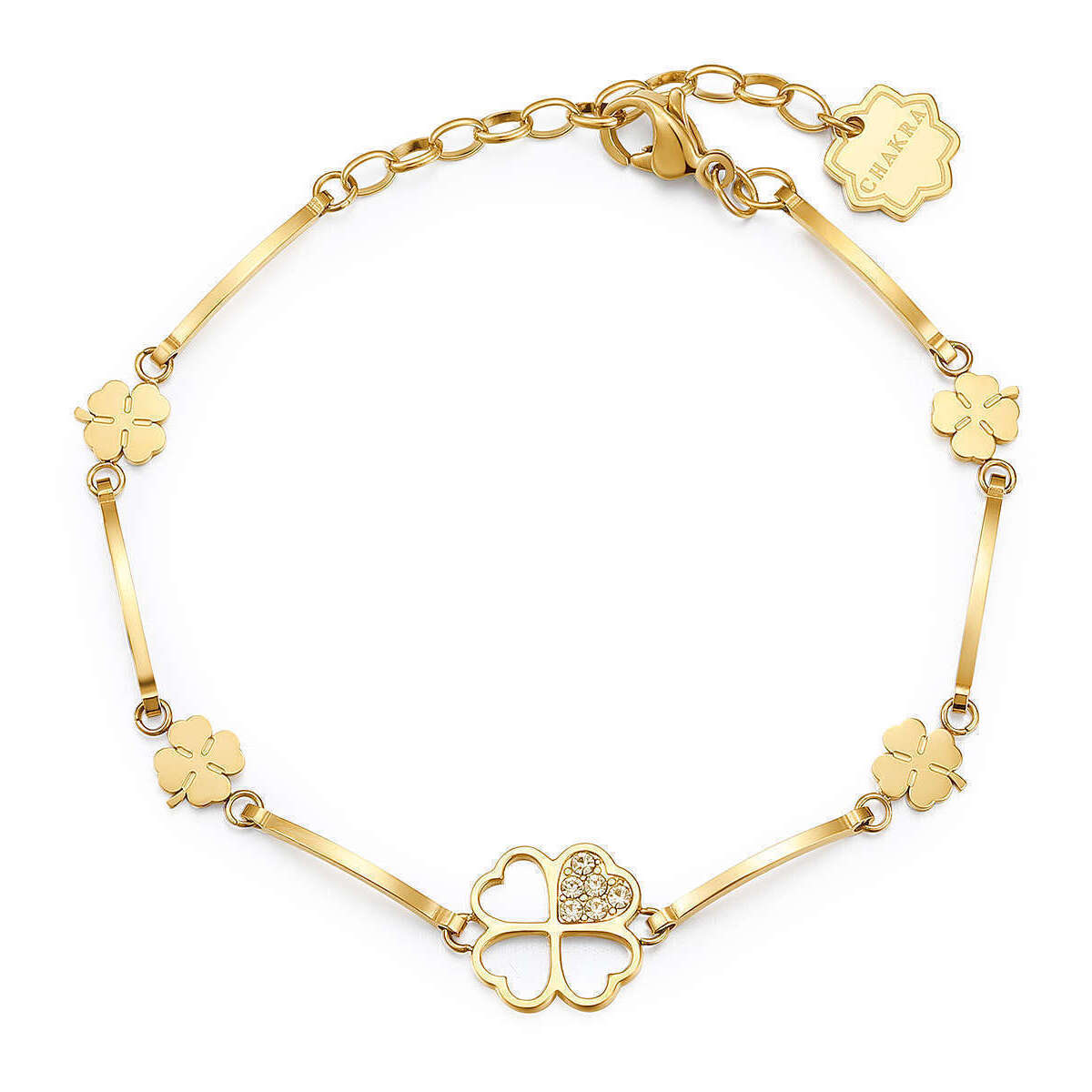 Il bracciale BHKB012 della collezione Chakra firmata Brosway è un gioiello portafortuna che unisce stile e significato. Realizzato in acciaio inossidabile con finitura dorata, è impreziosito da piccoli quadrifogli lungo tutta la circonferenza e da un pendente centrale traforato a forma di quadrifoglio, con uno dei cuori decorato con cristalli luminosi.