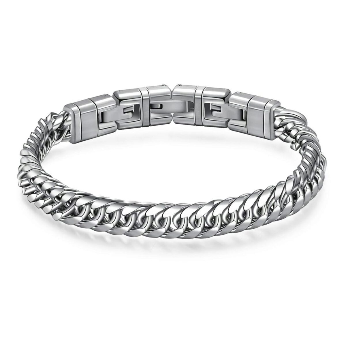 Bracciale da uomo in acciaio con catena groumette doppia e chiusura a maglie rigide. Eleganza robusta per ogni occasione.