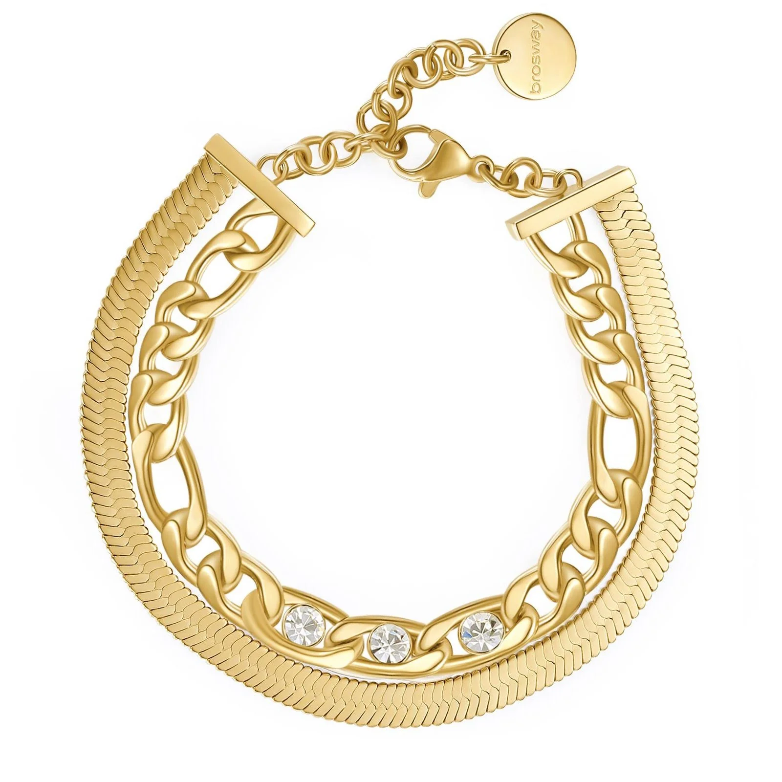 Il Bracciale Brosway Symphonia (mod. BYM112) è un gioiello sofisticato e moderno, perfetto per chi ama uno stile elegante con un tocco di brillantezza. Realizzato in acciaio 316L placcato oro, presenta un doppio filo a catena, uno più sottile “flat” e l’altro a maglia classica, con cristalli che aggiungono luce e raffinatezza.