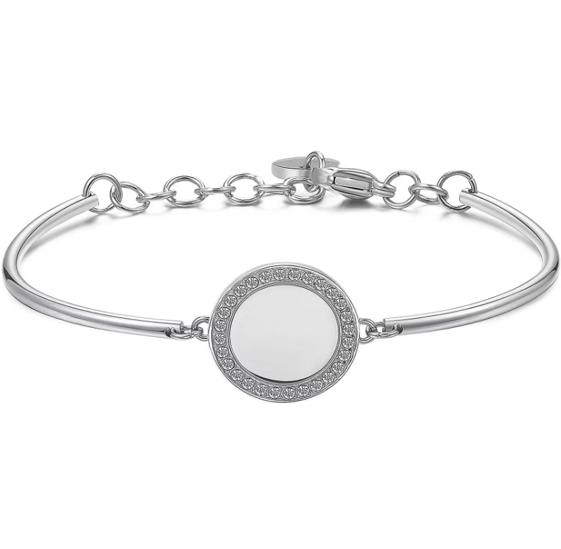 Bracciale in acciaio con medaglietta rotonda. Chiusura a moschettone e diametro 70 mm.