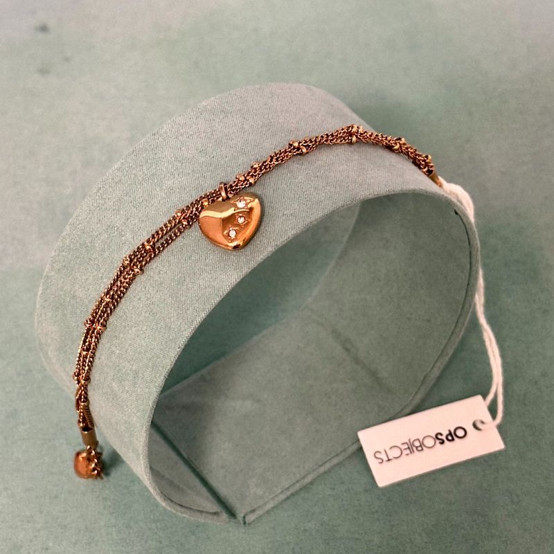 Bracciale elegante e raffinato firmato OPSOBJECTS, realizzato con una particolare maglia multifilo in metallo color oro rosa. Al centro spicca un ciondolo a forma di cuore bombato, impreziosito da cristalli bianchi luminosi incastonati con disposizione asimmetrica, che donano un tocco prezioso e delicato. La chiusura a moschettone con prolunga consente una vestibilità regolabile e comoda.