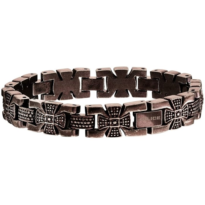 Bracciale Police da uomo in acciaio brunito con maglia decorata a croci in rilievo. Design deciso, perfetto per uno stile grintoso e urban.
