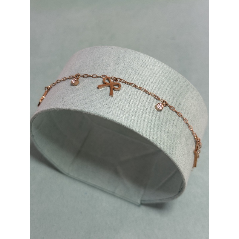Bracciale in acciaio color oro rosa con charm stella, fiocco e punti luce. Lunghezza regolabile 15 + 4 cm, elegante e perfetto per ogni occasione.
