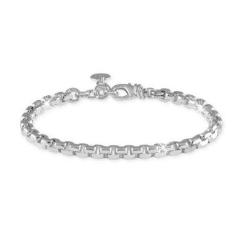 Un bracciale dallo stile classico rivisitato in chiave contemporanea, firmato UNOAERRE. Questo gioiello è realizzato in bronzo con finitura rodiata lucida ed è caratterizzato da una catena veneziana bombata, nota per la sua struttura compatta e la lucentezza impeccabile.
