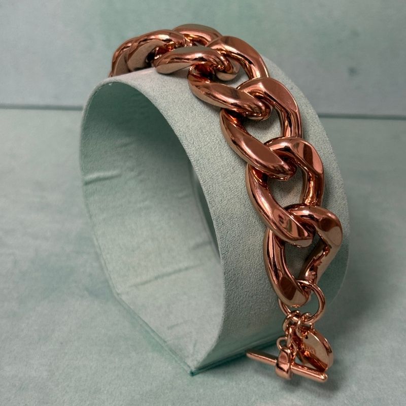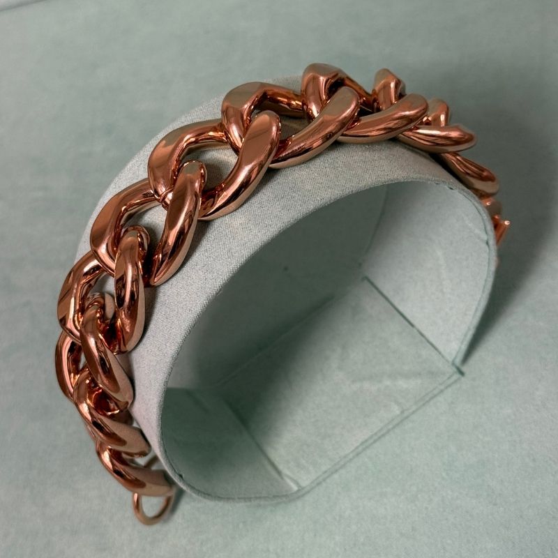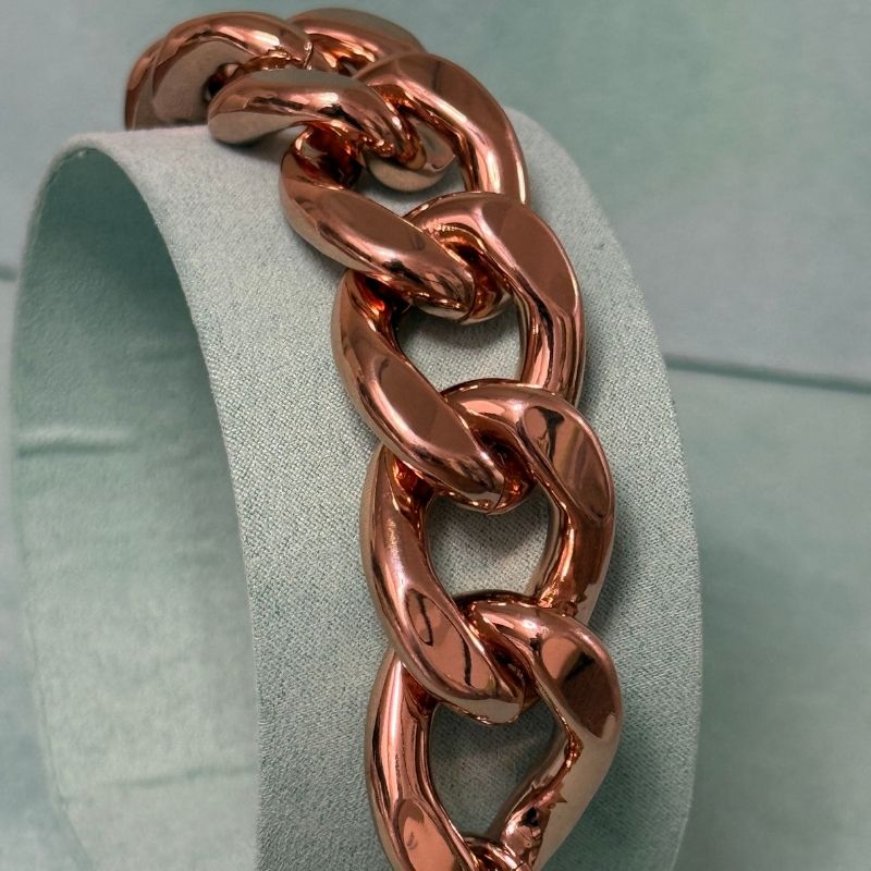 Eleganza e grinta si fondono in un unico gioiello: il bracciale UNOAERRE in bronzo placcato oro rosa è la scelta perfetta per chi vuole distinguersi con stile. La lavorazione grumetta maxi bombata, dal design audace ma armonioso, veste il polso con carattere e femminilità. La finitura oro rosa conferisce un’allure calda e sofisticata, ideale per ogni occasione.