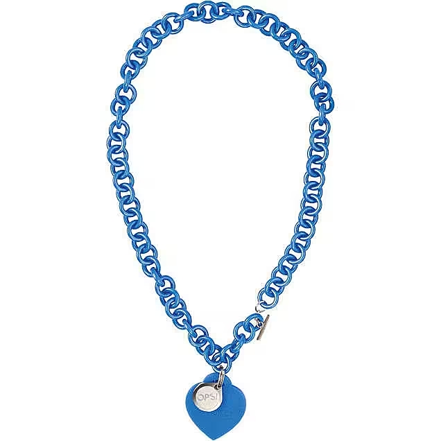 Questa è una collana del marchio OPSOBJECTS, noto per i suoi gioielli dal design giovane e originale. Il pendente ha la forma di un cuore di colore blu, realizzato in silicone, con inciso il logo “OPSOBJECTS COOL JEWELLERY” e la scritta “Love… Made in Italy”.
