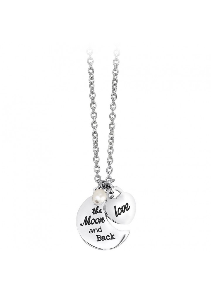 Scopri la collana Love You to the Moon and Back, un gioiello dal design semplice ma ricco di significato. Realizzata in acciaio lucido, presenta due charm tondi: uno con la scritta “Love” e l’altro con l’incisione “The Moon and Back”, accompagnati da una piccola perla che aggiunge un tocco di dolcezza e raffinatezza.