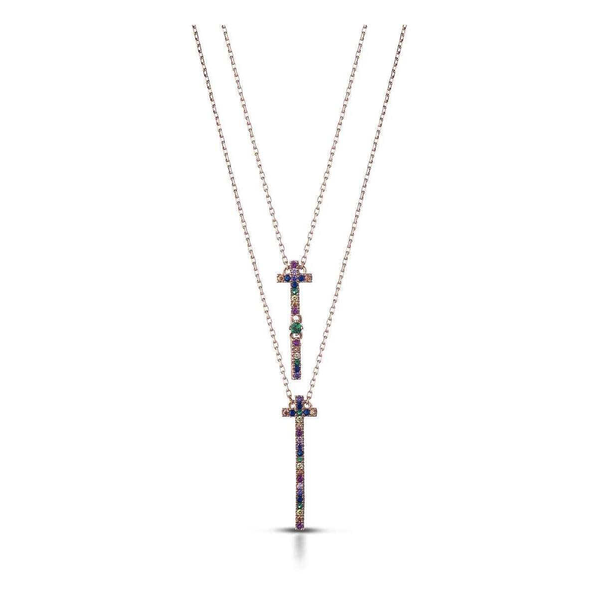 Collana donna in argento rosé dal design elegante e simbolico, caratterizzata da una croce verticale impreziosita da cristalli multicolore luminosi. La doppia catena crea un raffinato effetto layered, valorizzando il pendente e donando movimento e stile. Perfetta per chi ama accessori di carattere ma delicati, questa collana è ideale per l’uso quotidiano o per completare outfit eleganti e serali. Un gioiello significativo e moderno, perfetto anche come idea regalo.