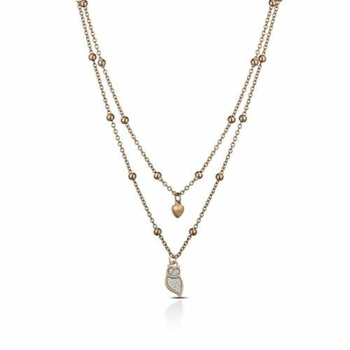 Collana Da Donna Di Ops Objects Della Collezione Glitter Fancy. Gioiello In Acciaio Di Colore Collana Doppia Catena Color Argento E Ciondolo Color Oro Rosa E Microcristalli Con Microcristalli Di Colore Argento. Ciondolo In Oro Rosa E Microcristalli Argentei E Dettagli A Forma Di Gufo.