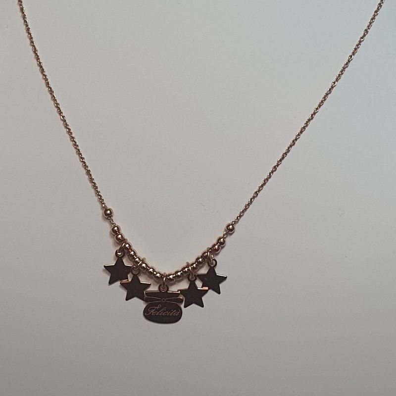 - Motivo: Stelle pendenti e targhetta incisa “Felicità”