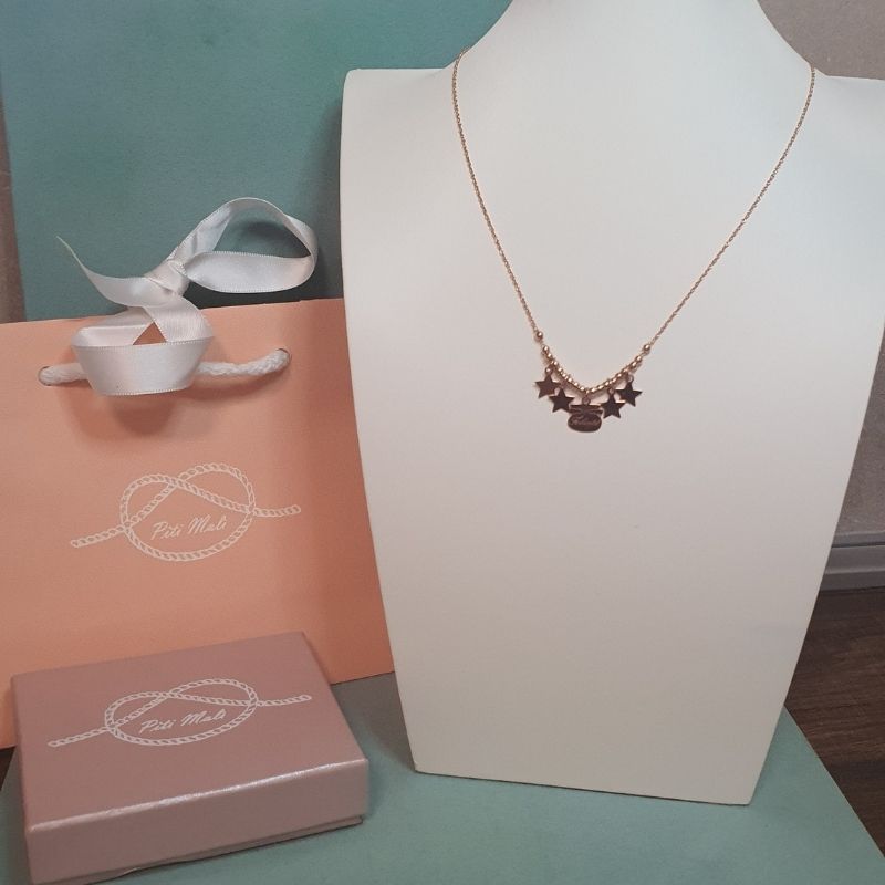 La collana Piti Mali in argento 925 con stelle pendenti e targhetta “Felicità” è un gioiello che racchiude un messaggio positivo e una raffinata eleganza.