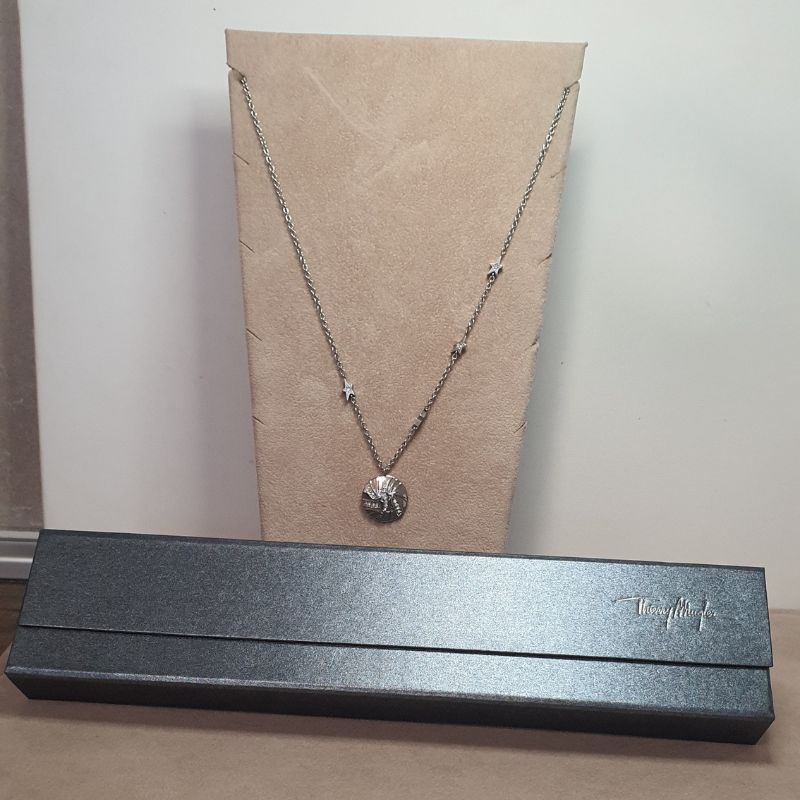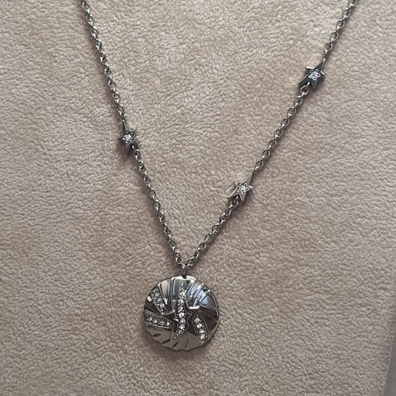 Elegante collana Thierry Mugler in acciaio argentato con catena impreziosita da piccole stelle e pendente tondo decorato da una stella tridimensionale con zirconi bianchi luminosi.