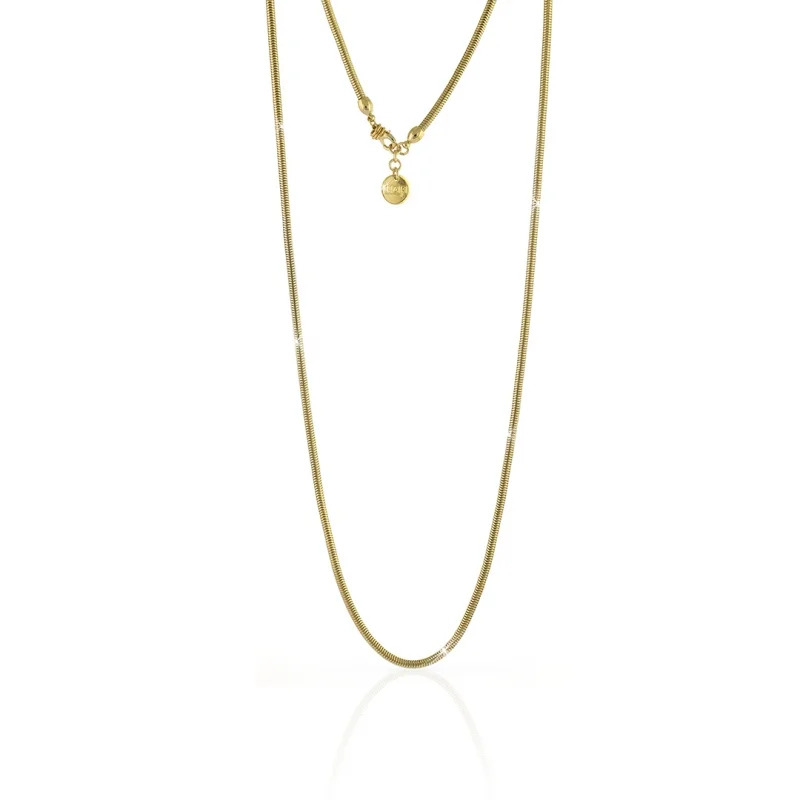 Minimalismo e raffinatezza si fondono in questa collana Unoaerre dal design essenziale e contemporaneo. Realizzata in bronzo con bagno dorato, si distingue per la catena snake, flessibile e setosa, che si adagia sul décolleté con eleganza.