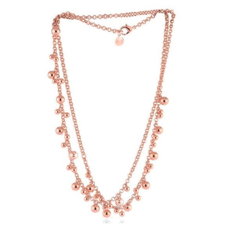 Collana Unoaerre Fashion Jewellery da donna realizzata in bronzo con finitura rosata lucida, composta da due fili di catena decorati con sfere pendenti di diverse dimensioni.