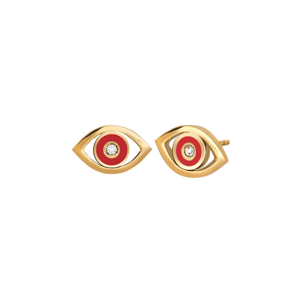 Realizzati in acciaio anallergico con finitura color oro, presentano un design moderno a forma di occhio portafortuna, con smalto rosso centrale e un cristallo luminoso incastonato al centro.