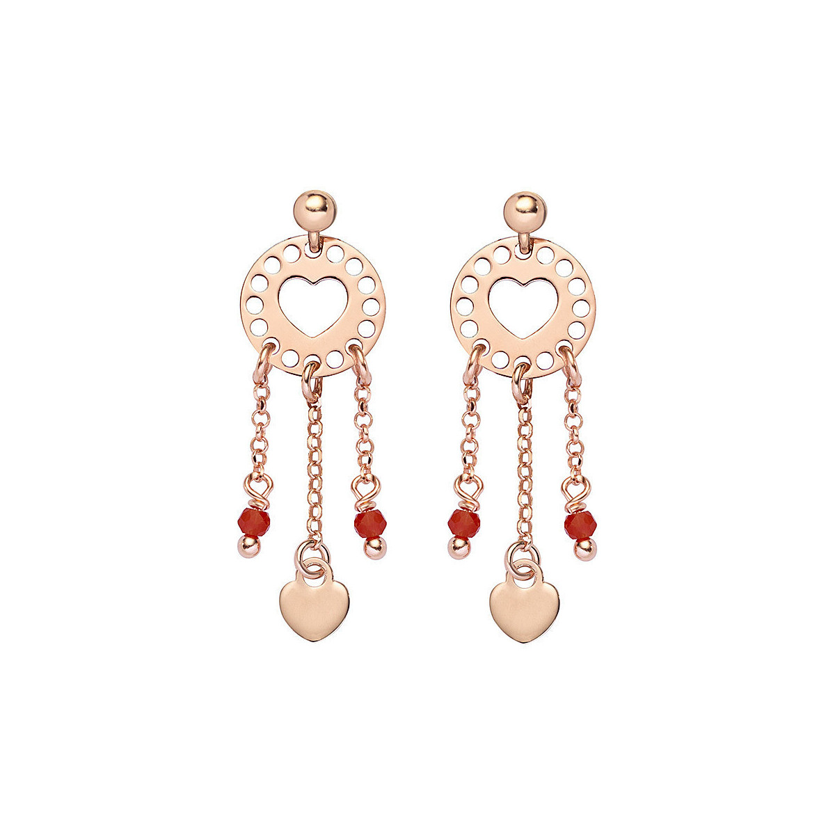 Porta con te un messaggio di amore e protezione con gli orecchini della collezione Acchiappamore firmata Amen. Un design delicato e simbolico, con un cerchio traforato da un cuore centrale e tre catenine pendenti decorate da piccoli cuori e pietre rosse.