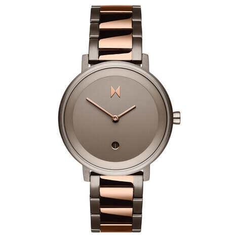 Il quadrante pulito senza numeri, con logo MVMT e lancette in oro rosa, esprime un’eleganza essenziale che non passa inosservata.